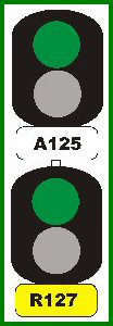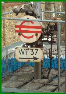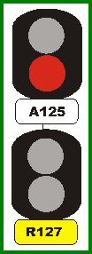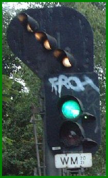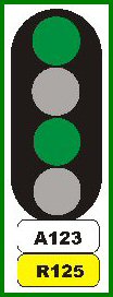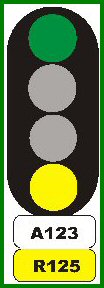 The apparent green and yellow is in reality two separate signals. The green is the proceed aspect of a stop signal while the yellow is the caution aspect of a repeater (not a distant). When the stop signal shows danger the repeater is completely extinguished. Repeaters are used where sighting distances are restricted and each one is for a designated signal. Sometimes a repeater is for more than one stop signal, but not always the next. To improve sighting in bad visibility additional repeaters are used. These are a miniature yellow/green signal with a white surround marked “Fog Repeater”. In multiple aspect area the yellow is replaced by a lunar white lamp with an “F” on the lens. In the diagrams the position of the signal plates is to highlight which relates to the signal and which to the repeater. In operation the plates are often mounted in the way illustrated for the four aspect version. In practice plates are not necessarily physically attached to the signals - there are many times where the plate is screwed to an adjacent wall or other piece of infrastructure - they are even found ‘on the ground’ beneath a signal - particularly in covered areas such as tunnels where the signal head is of the tunnel type. |